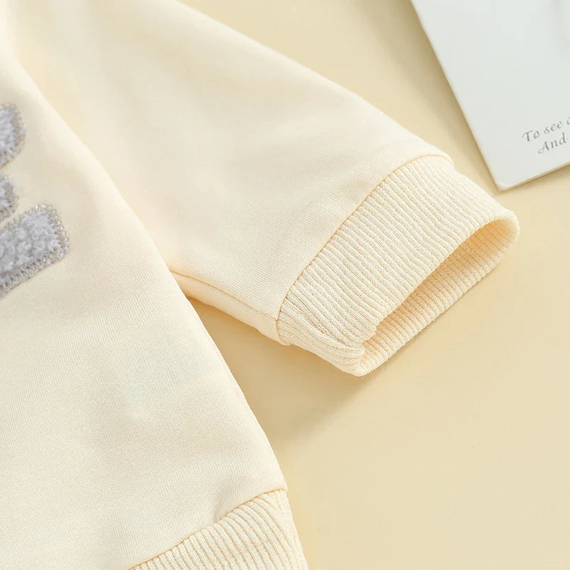 This delightful set features a plush letter embroidery long sleeve sweatshirt paired with elastic sweatpants, offering both style and comfort.?